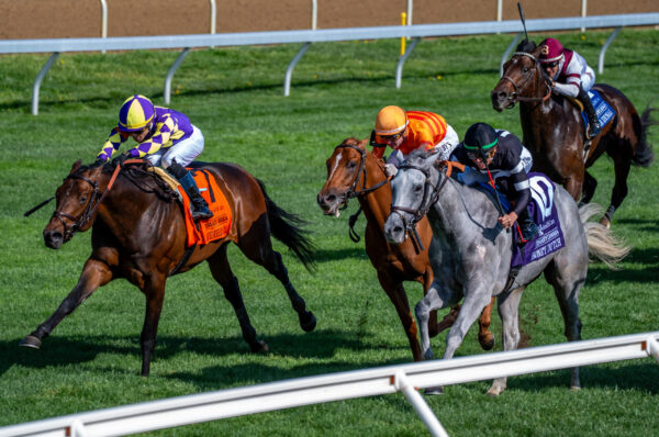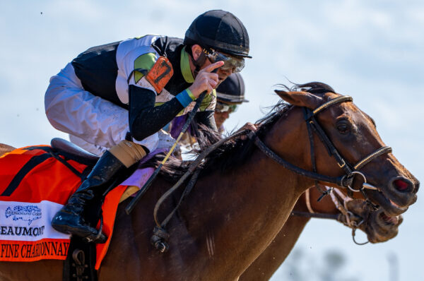 Jockey Brian Hernandez Jr. rides Fine Chardonnay to the finish line during the opening races of the Spring Meet at Keeneland in Lexington, Kentucky, on Friday, April 3, 2026. Peyton Tindall/The Watchdog