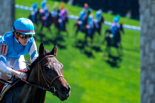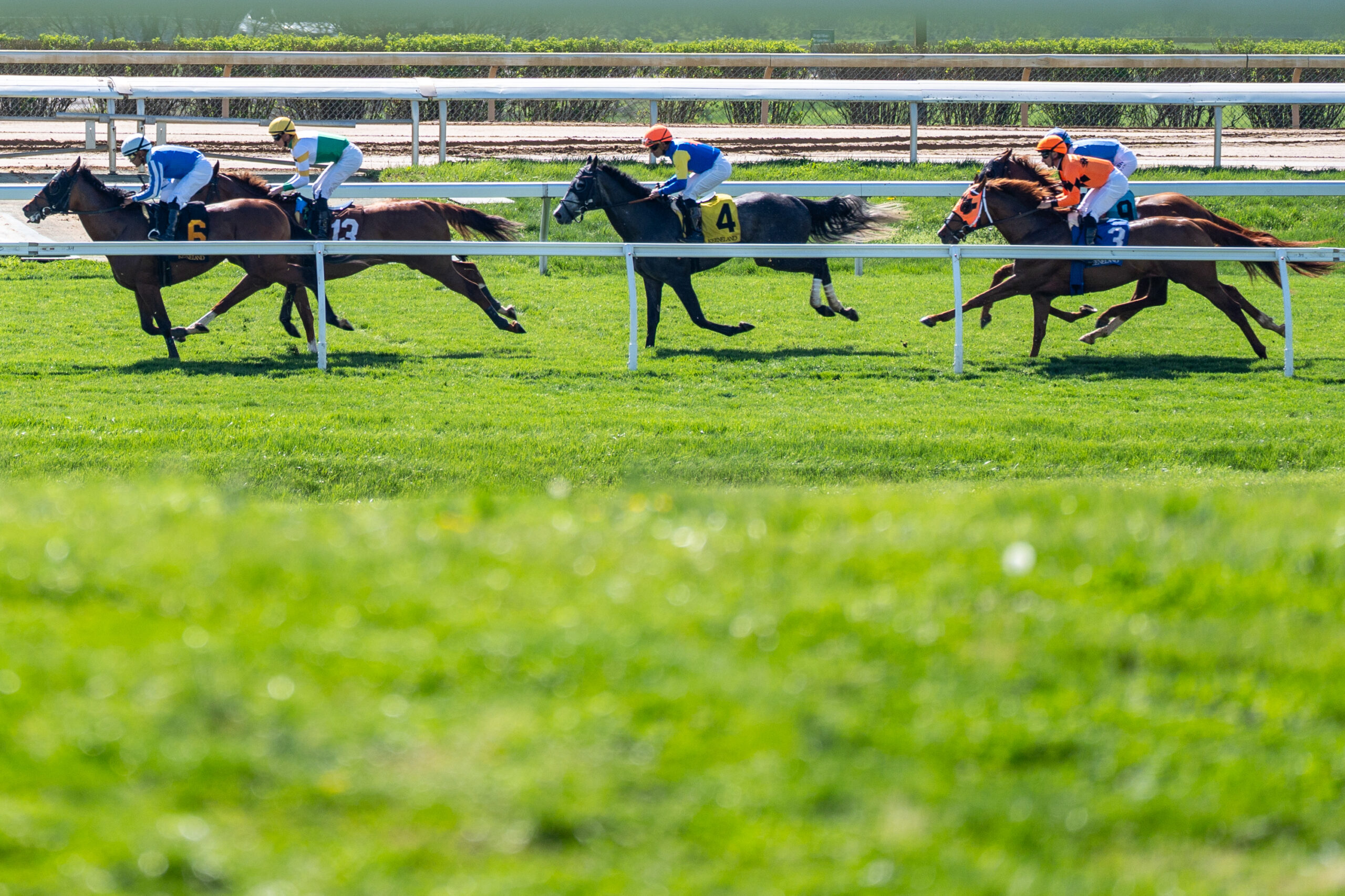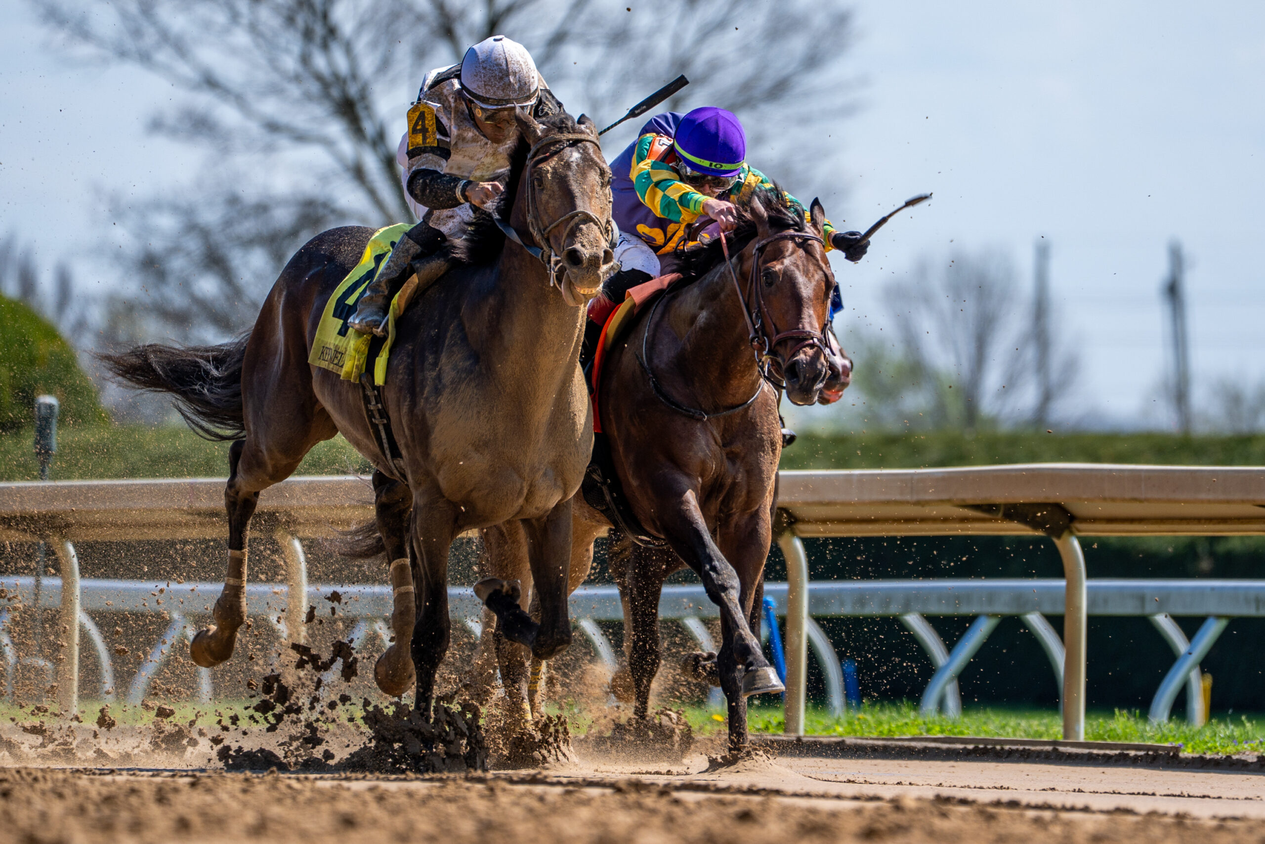 Jockeys ride their horses to the finish during the opening races of the Spring Meet at Keeneland in Lexington, Kentucky, on Friday, April 3, 2026. Peyton Tindall/The Watchdog