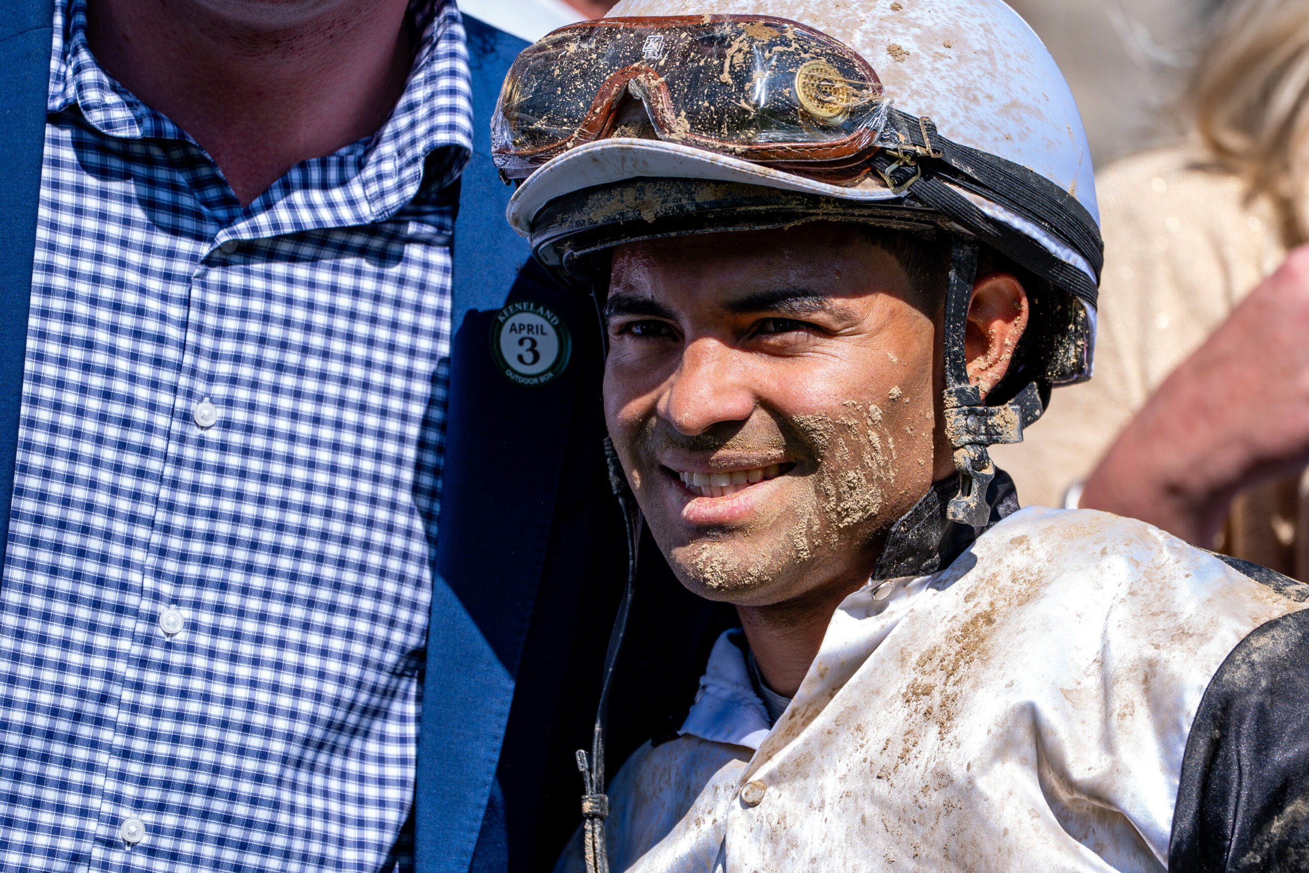 Jockey Luis Saez celebrates a stakes race win with horse owners and trainers during the opening races of the Spring Meet at Keeneland in Lexington, Kentucky, on Friday, April 3, 2026. Peyton Tindall/The Watchdog