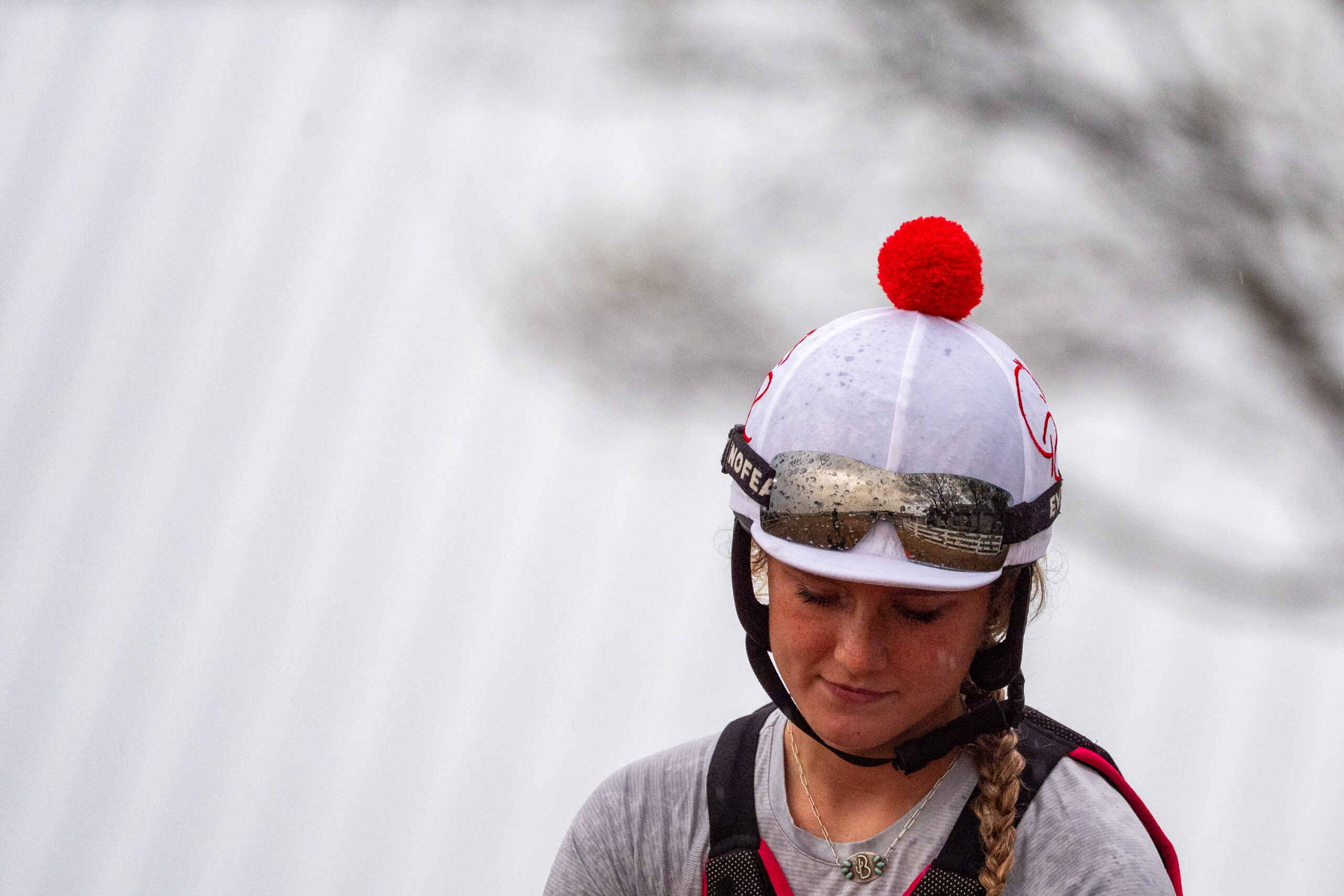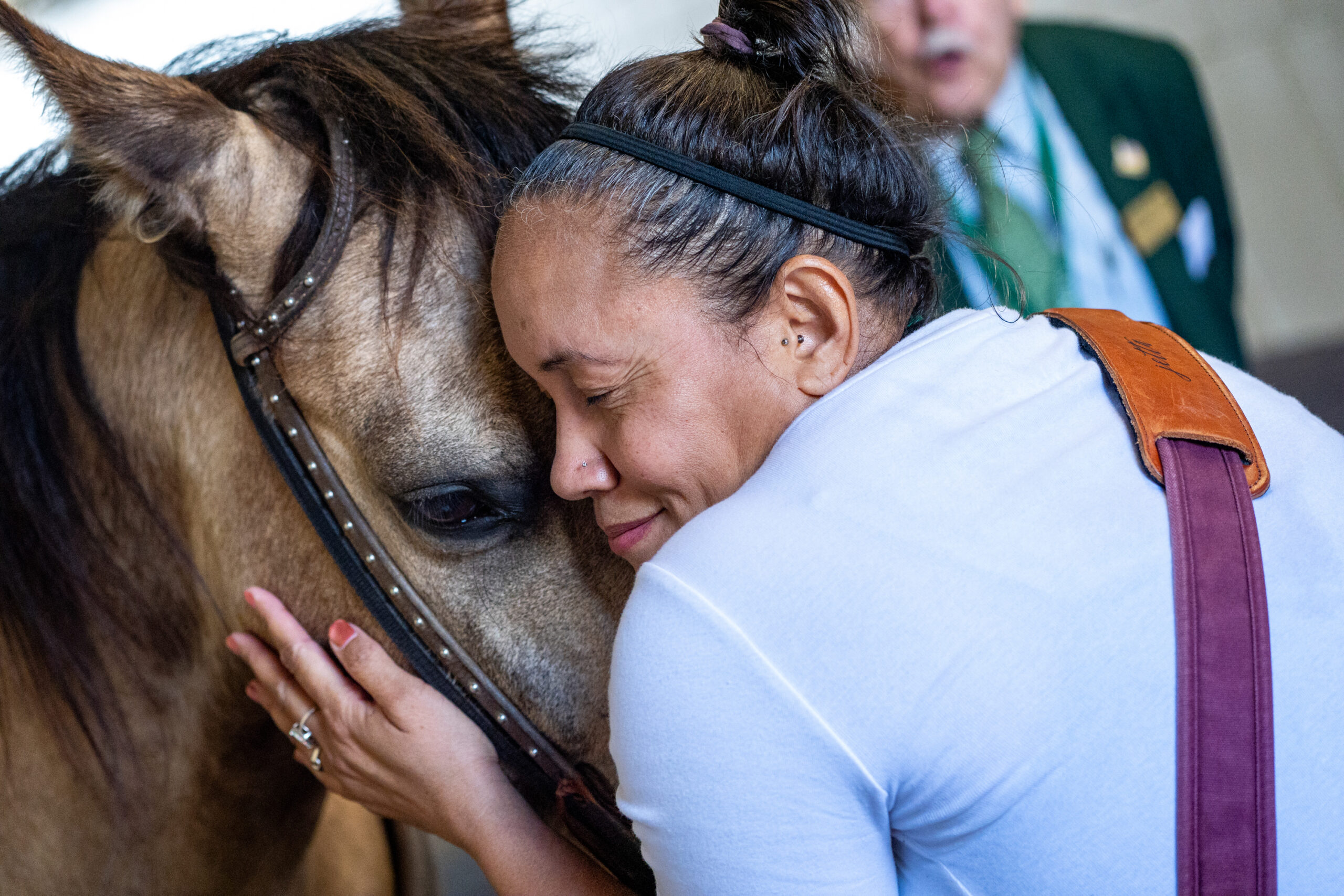 A track photographer hugs an out riders’ horse during the opening races of the Spring Meet at Keeneland in Lexington, Kentucky, on Friday, April 3, 2026. Peyton Tindall/The Watchdog