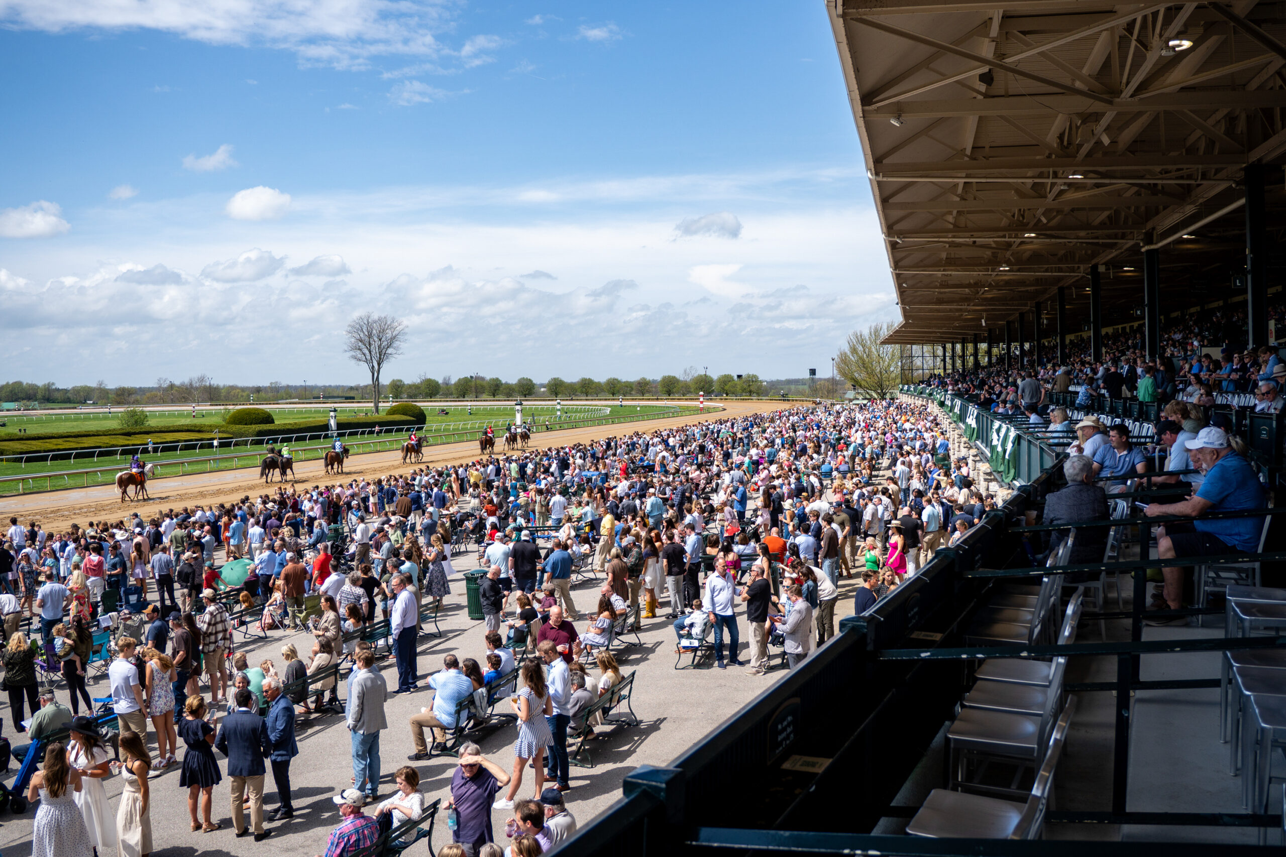 Horse Racing enthusiasts watch the horses race down the track during the opening races of the Spring Meet at Keeneland in Lexington, Kentucky, on Friday, April 3, 2026. Peyton Tindall/The Watchdog