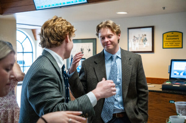 University of Kentucky students Roman Stober, left, and Eli Von Dielingen, right, celebrate after a horse they bet on won at Keeneland in Lexington, Kentucky, on Friday, April 3, 2026. Peyton Tindall/The Watchdog