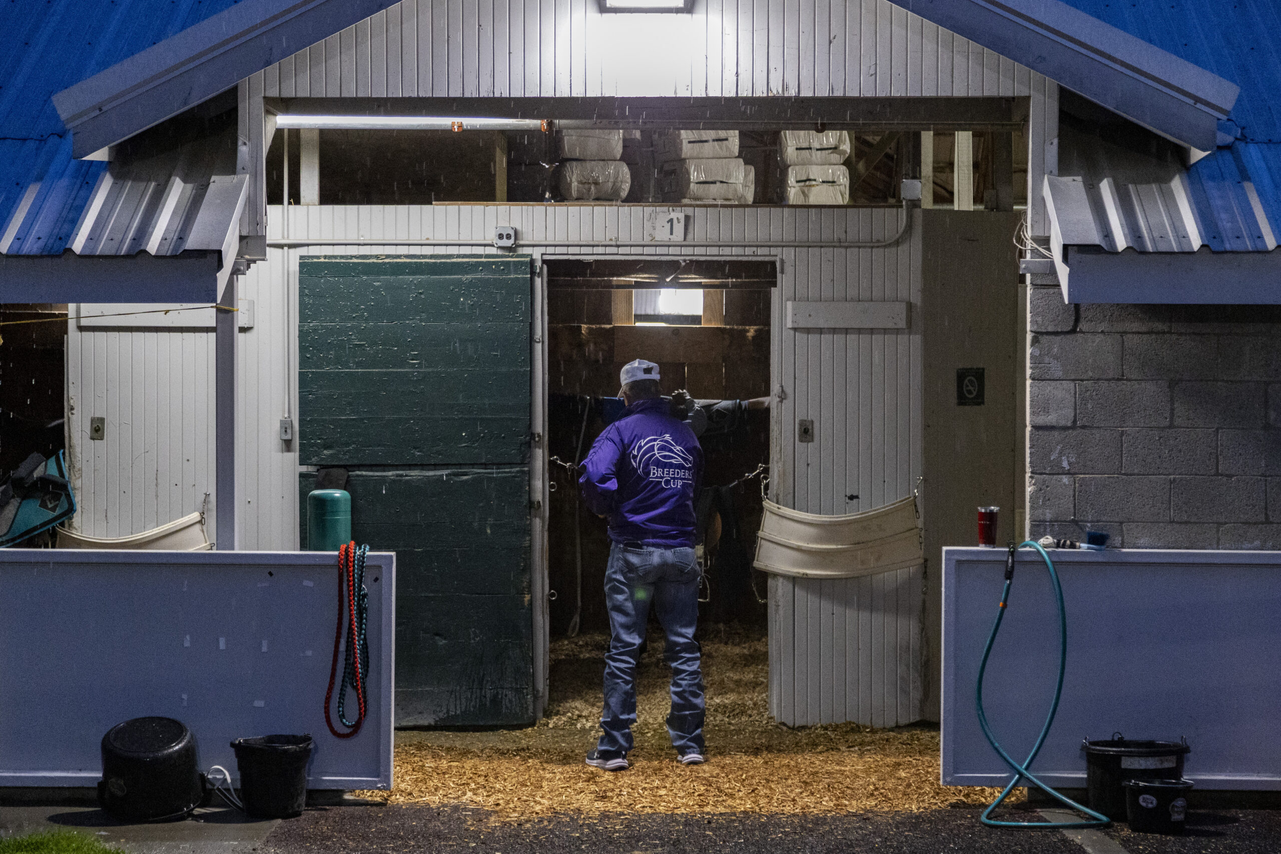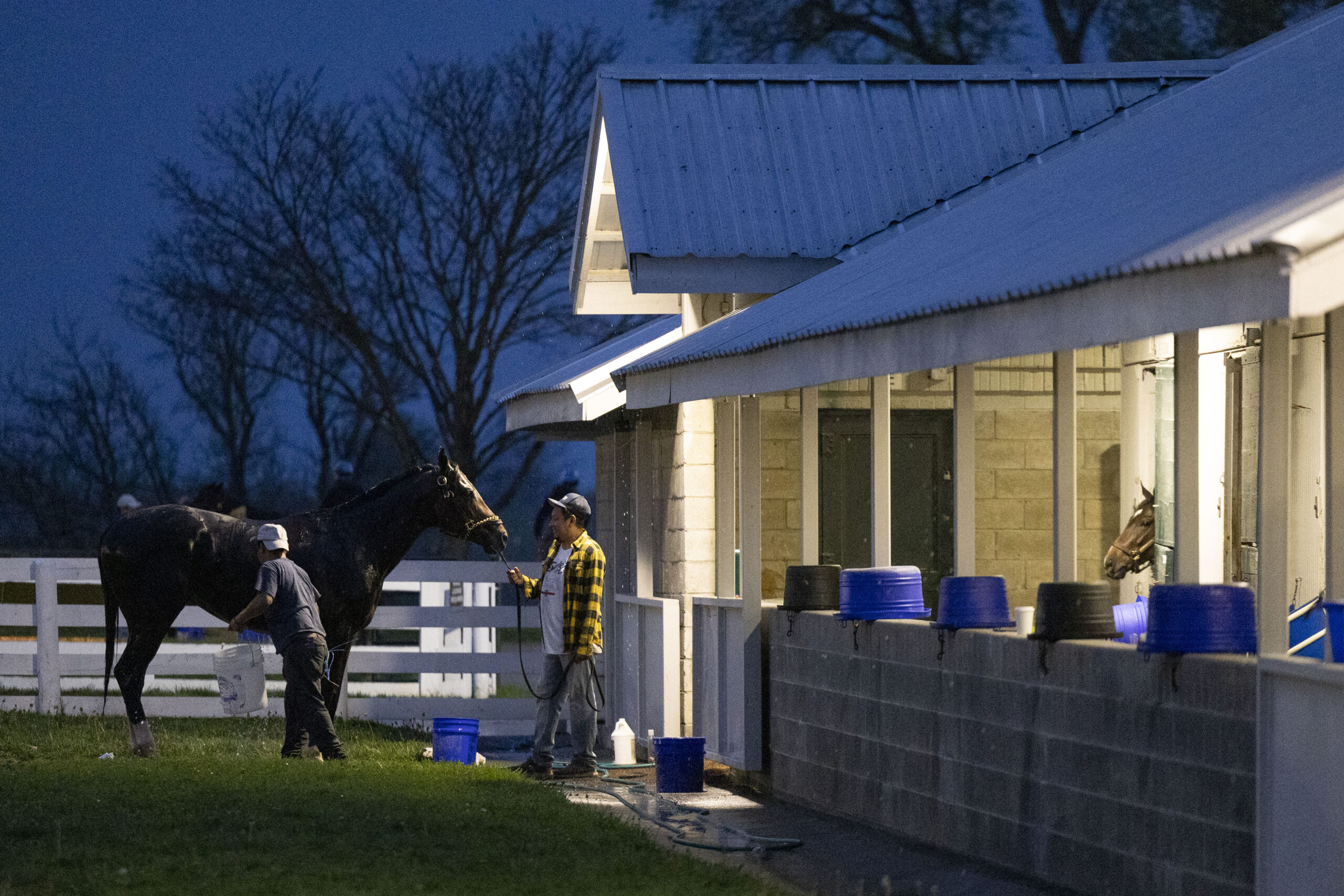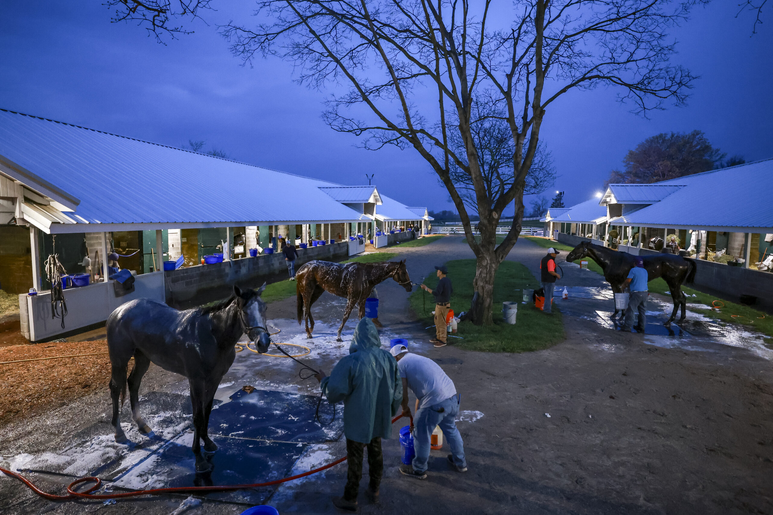Trainers wash horses during morning workouts of opening weekend at Keeneland in Lexington, Kentucky, on Friday, April 3, 2026. Christian Kantosky/The Watchdog