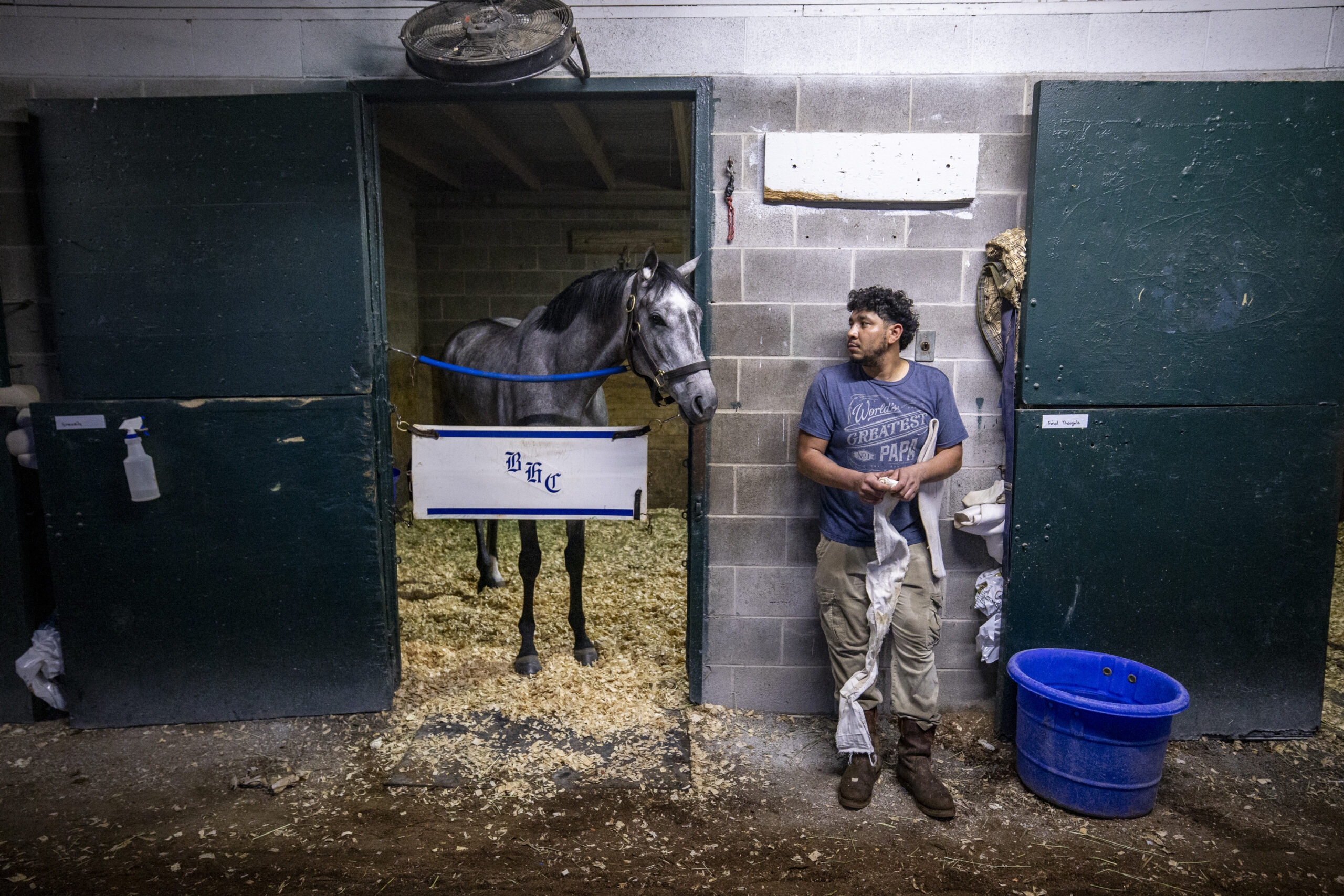 Nestor, who has worked at Keeneland for 5 years, rolls up linen cloth after washing a horse during morning workouts of opening weekend at Keeneland in Lexington, Kentucky, on Friday, April 3, 2026. Christian Kantosky/The Watchdog