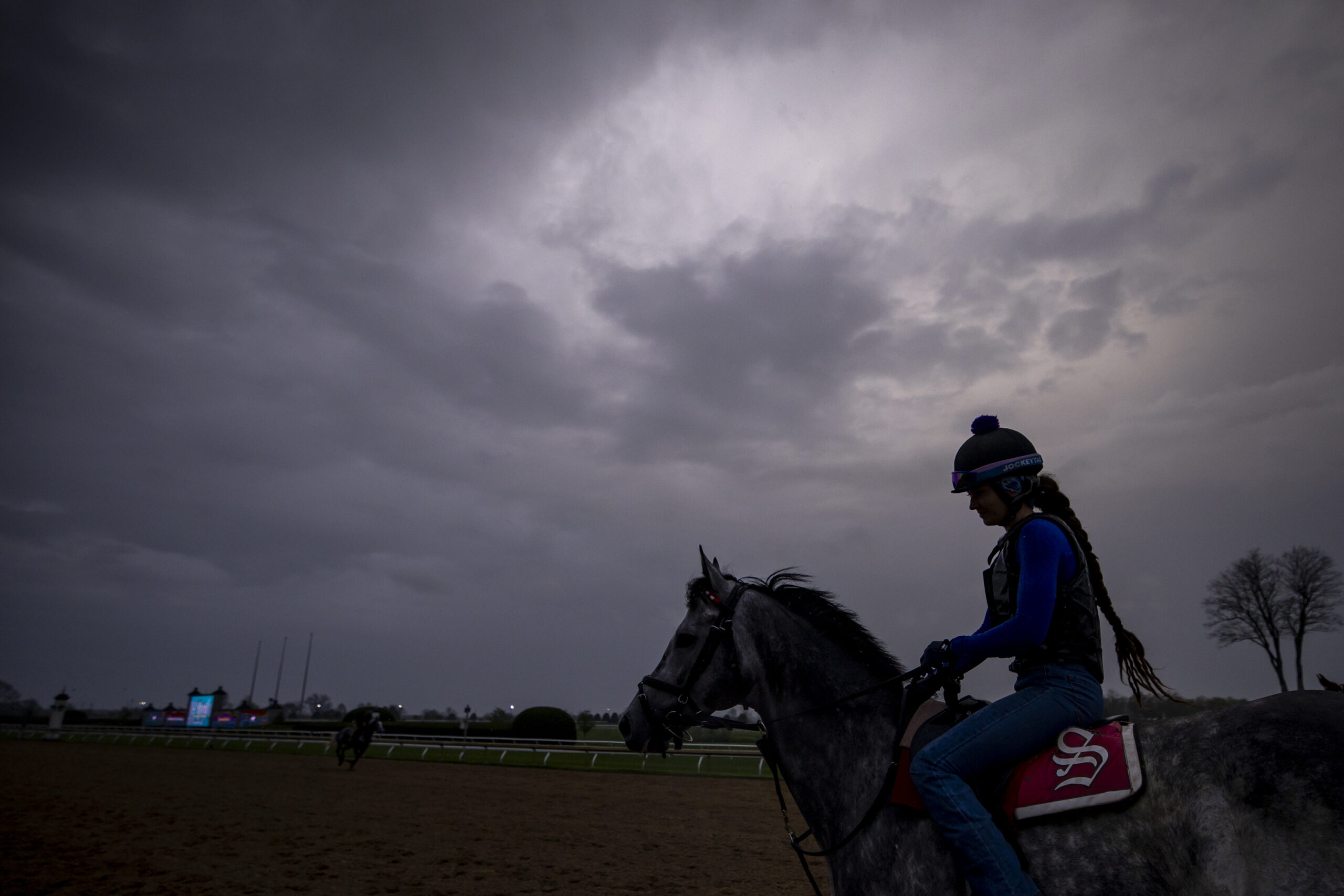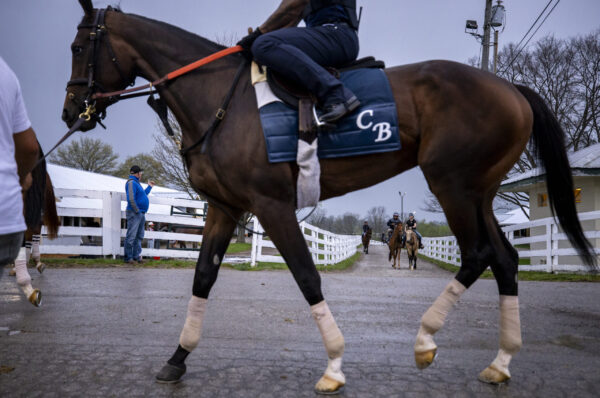 A trainer rides their horse around the track during morning workouts of opening weekend at Keeneland in Lexington, Kentucky, on Friday, April 3, 2026. Christian Kantosky/The Watchdog