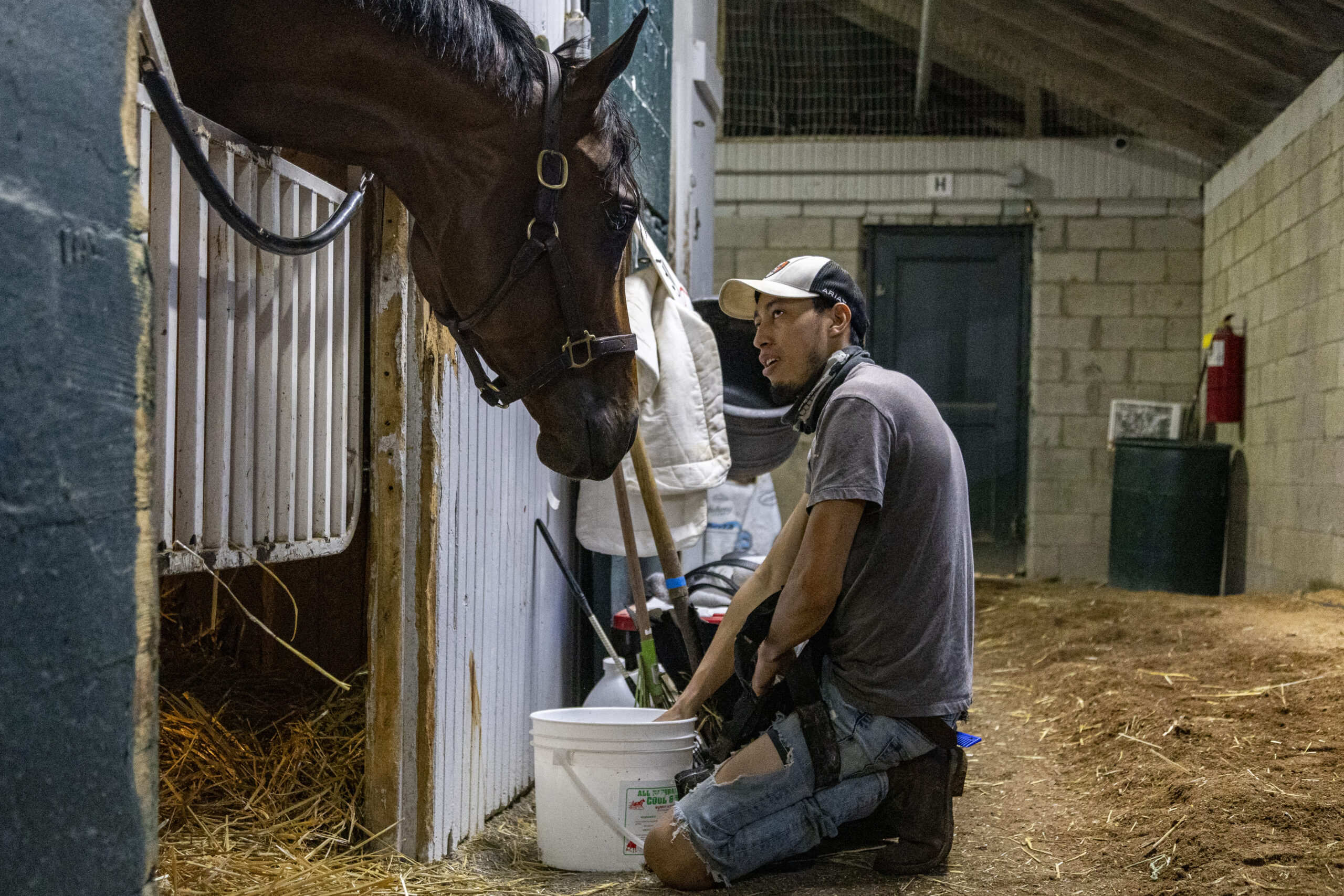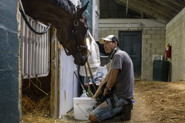 Josue Aguilar feeds ice cubes to a horse during morning workouts on opening day at Keeneland in Lexington, Kentucky, on Friday, April 3, 2026. Isabella Sepahban/The Watchdog