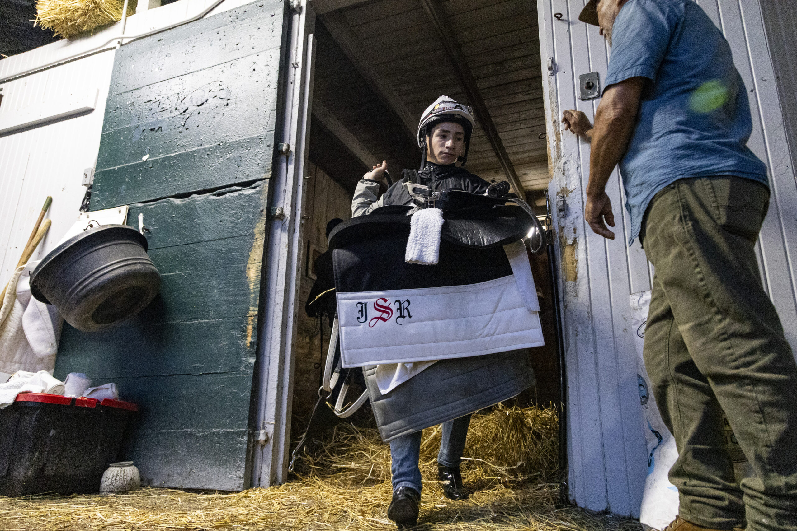 A jockey carries his saddle out of an enclosure during morning workouts on opening day at Keeneland in Lexington, Kentucky, on Friday, April 3, 2026. Isabella Sepahban/The Watchdog