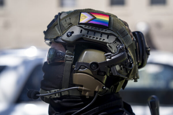 A person is seen wearing a helmet with a patch on it during the “No Kings” protest outside the Robert F. Stephens Courthouse in Lexington, Kentucky, on Saturday, March 28, 2026. Peyton Tindall/The Watchdog
