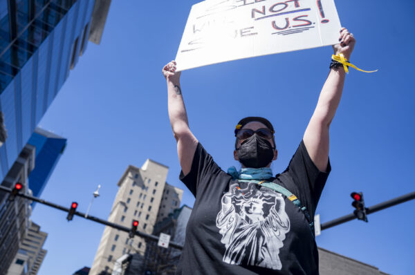 A person, walking through the street, holds up a sign during the “No Kings” protest outside the Robert F. Stephens Courthouse in Lexington, Kentucky, on Saturday, March 28, 2026. Peyton Tindall/The Watchdog