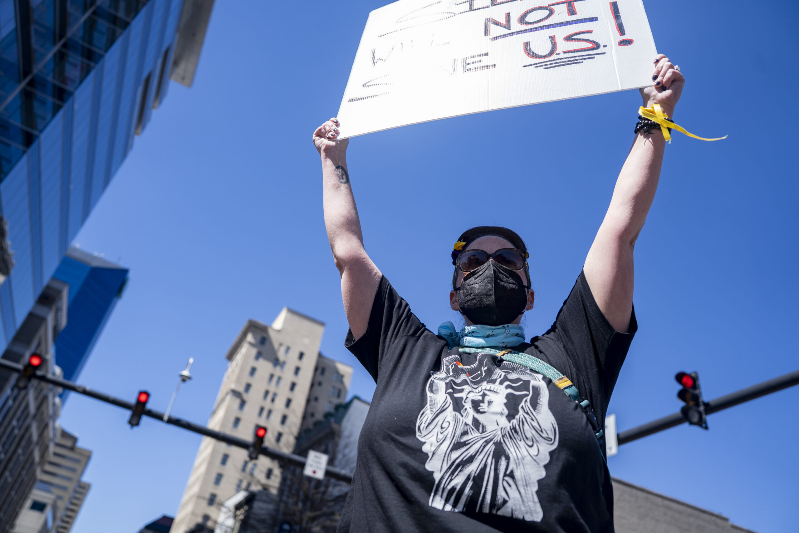 Protestor holds sign outside the Robert F. Stephens Courthouse, in Lexington, Kentucky, on Saturday, March 28, 2026. Sydney Novack/The Watchdog