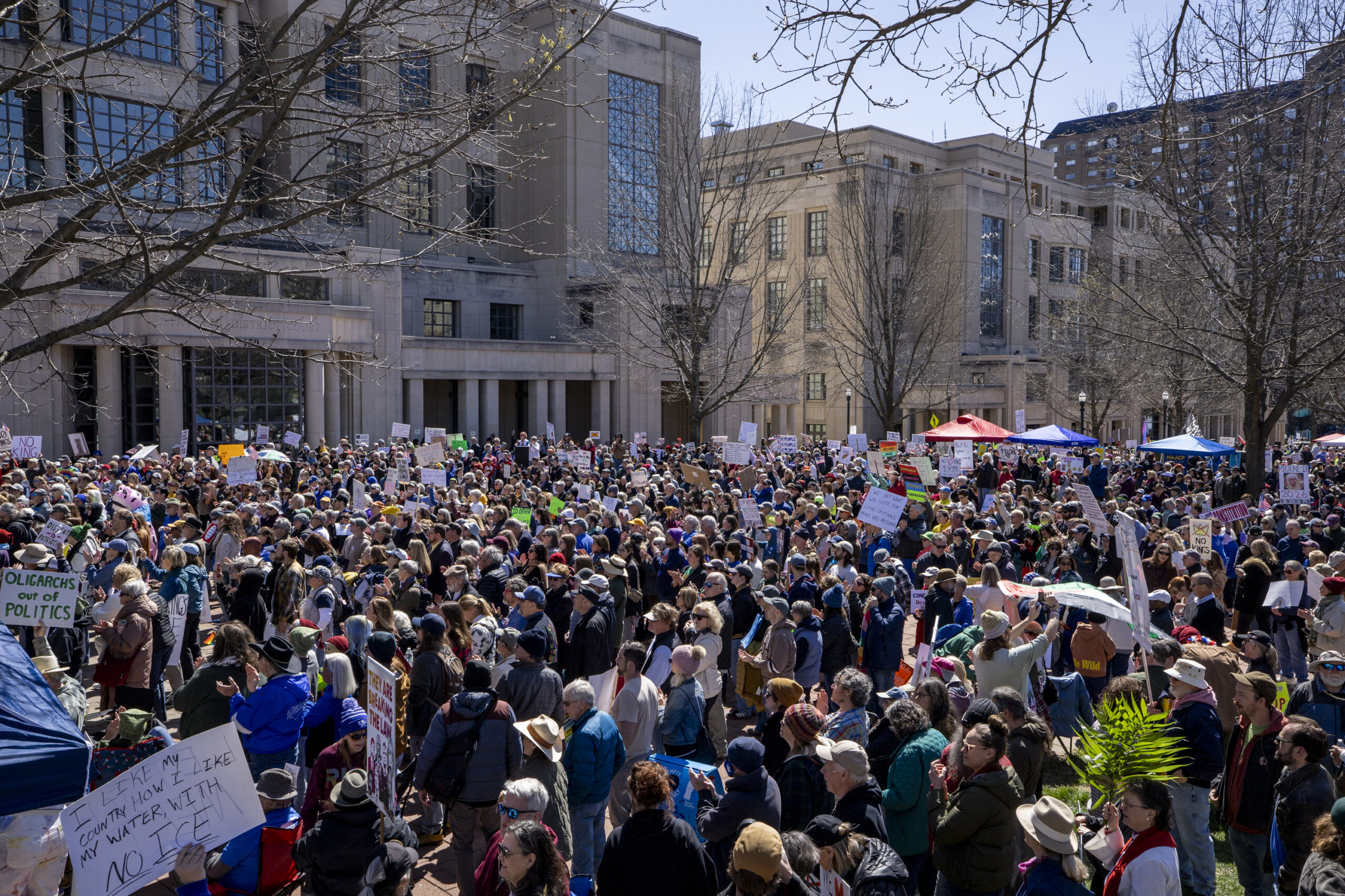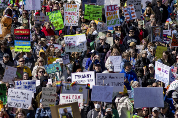 People gather and chant during the “No Kings” protest outside the Robert F. Stephens Courthouse in Lexington, Kentucky, on Saturday, March 28, 2026. Christian Kantosky/The Watchdog