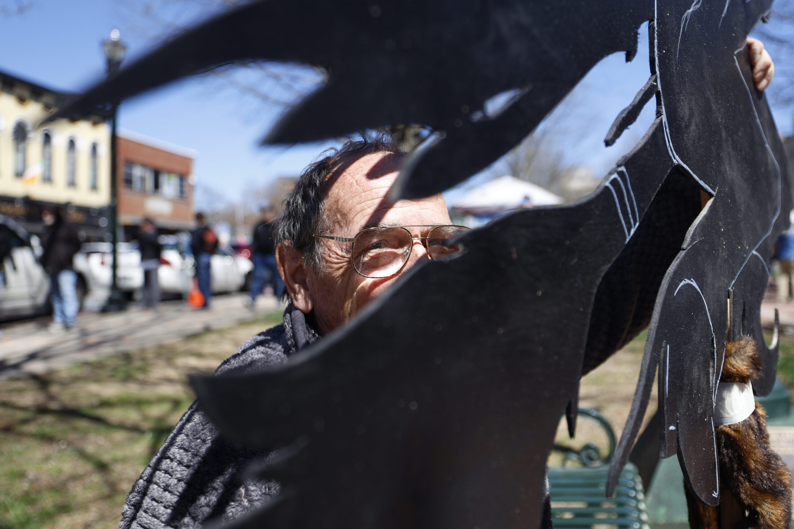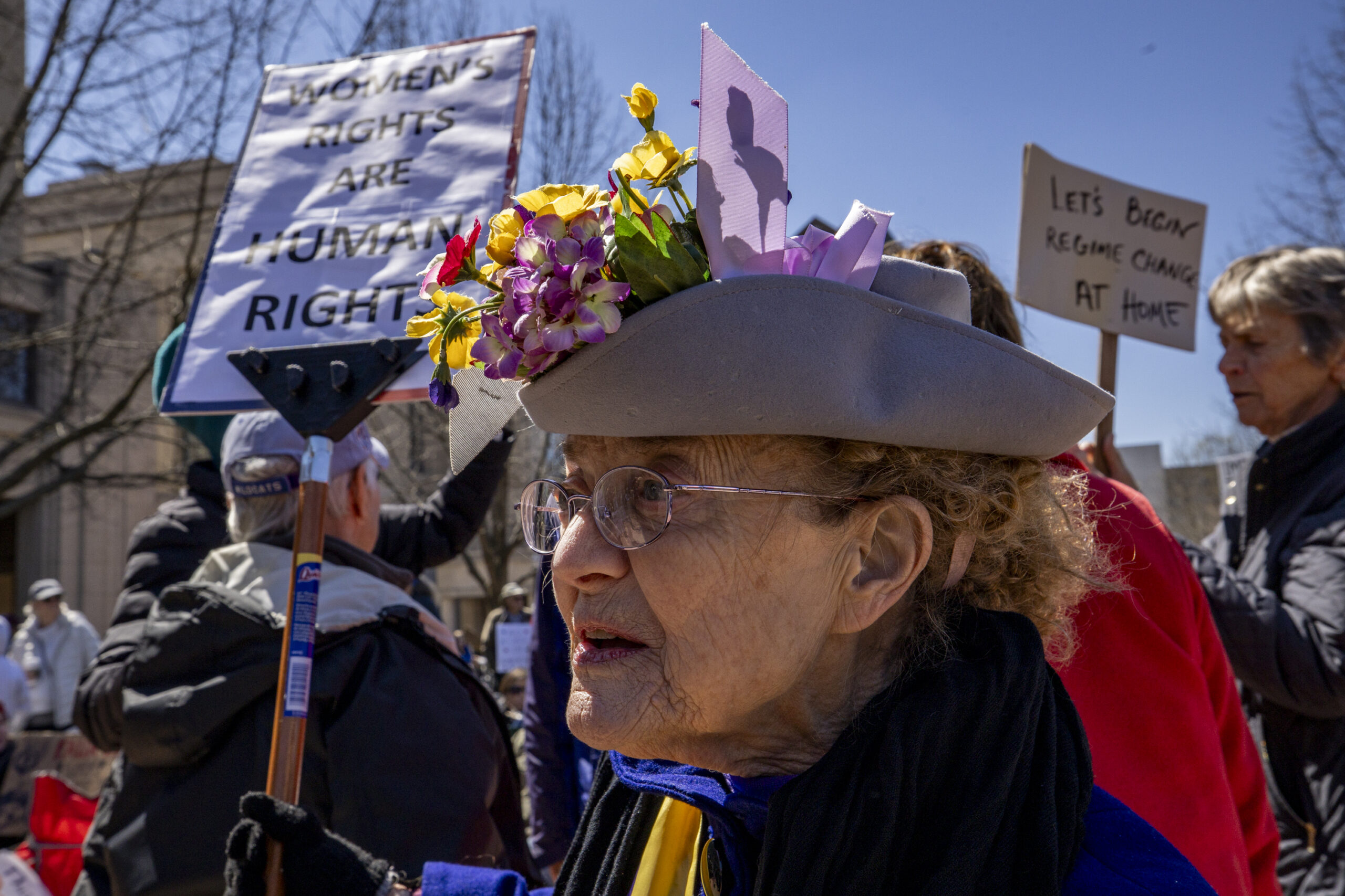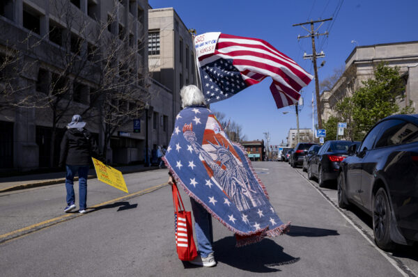 Diane Cahill, holding a flag, walks toward the plaza before the “No Kings” protest outside the Robert F. Stephens Courthouse in Lexington, Kentucky, on Saturday, March 28, 2026. Due to knee replacement surgery, Cahill wasn’t able to attend the last “No Kings,” but did rehab leading up to the third national protest. Christian Kantosky/The Watchdog