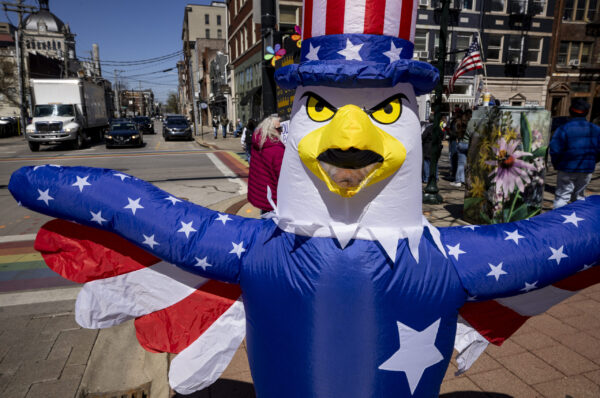 Meg Dumaine, wearing an inflatable eagle costume, stands on the corner of Limestone and Short Street during the “No Kings” protest outside the Robert F. Stephens Courthouse in Lexington, Kentucky, on Saturday, March 28, 2026. Christian Kantosky/The Watchdog