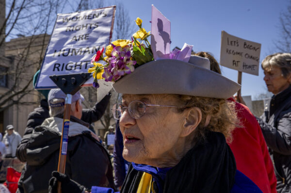 Cathy Taylor, wearing a suffragette costume, holds a sign up during the “No Kings” protest outside the Robert F. Stephens Courthouse in Lexington, Kentucky, on Saturday, March 28, 2026. Christian Kantosky/The Watchdog