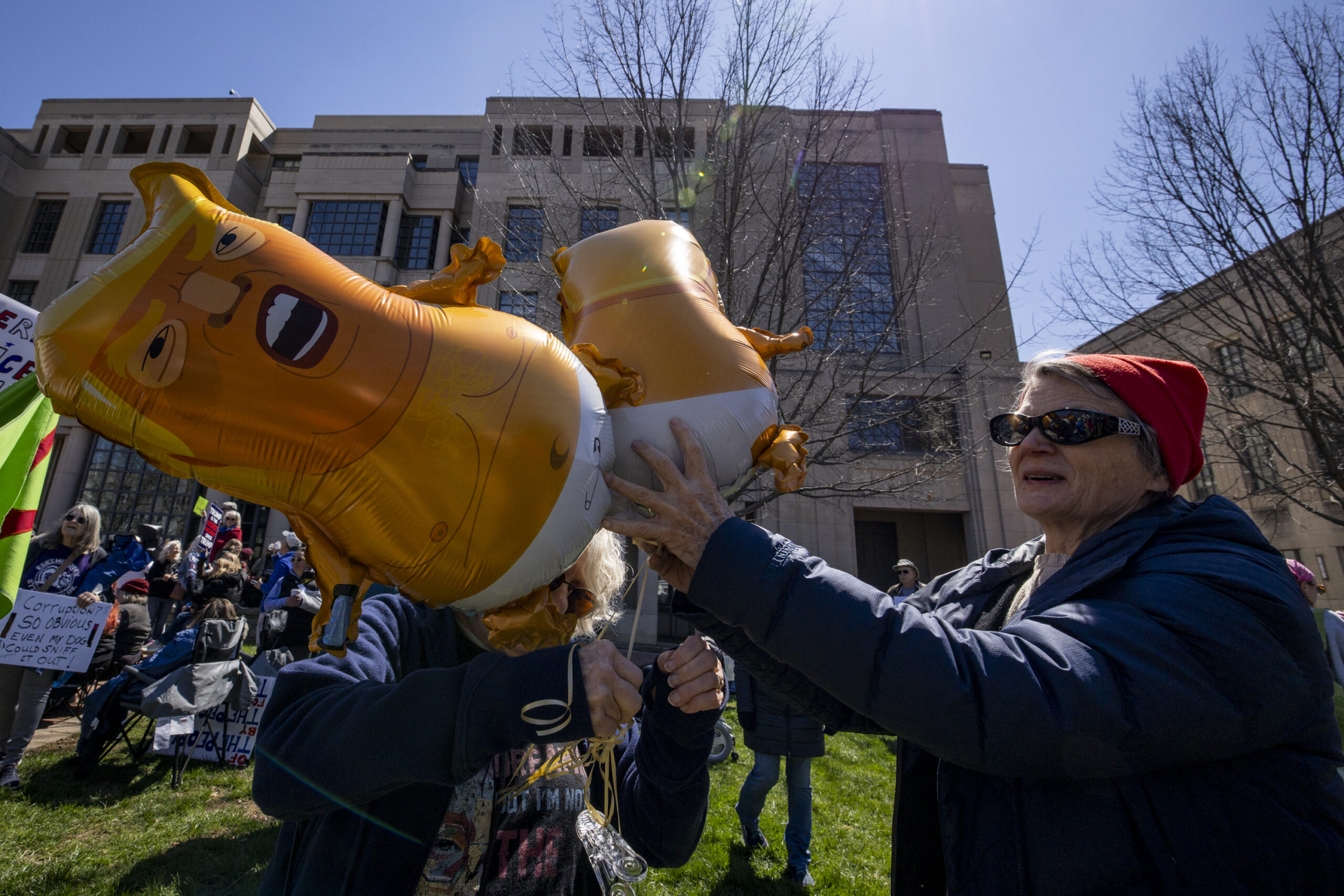 Cheryl Keenan, left, fixes baby Donald Trump balloons during the “No Kings” protest outside the Robert F. Stephens Courthouse in Lexington, Kentucky, on Saturday, March 28, 2026. Christian Kantosky/The Watchdog