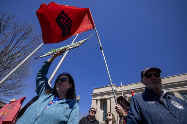 People hold up flags and signs during the “No Kings” protest outside the Robert F. Stephens Courthouse in Lexington, Kentucky, on Saturday, March 28, 2026. Christian Kantosky/The Watchdog