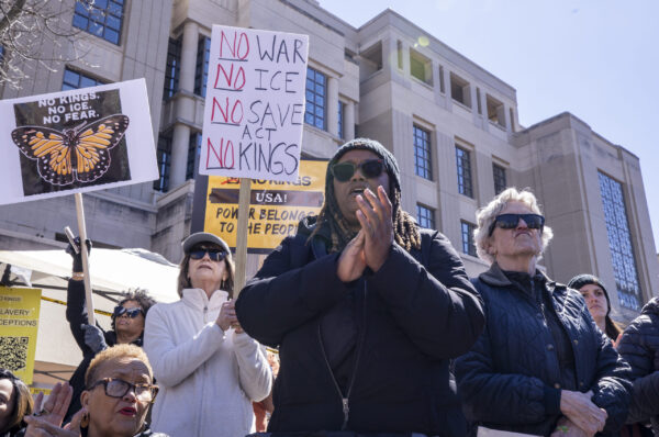 Kim Pennington, center, claps during the “No Kings” protest at the Robert F. Stephens Courthouse in Lexington, Kentucky, on Saturday, March 28, 2026. Christian Kantosky/The Watchdog