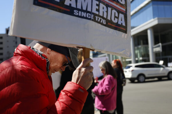 Jeff Burnette holds a sign outside the Robert F. Stephens Courthouse, in Lexington, Kentucky, on Saturday, March 28, 2026. Sydney Novack/The Watchdog. “The reason I am here is because I have two eyes and a brain”