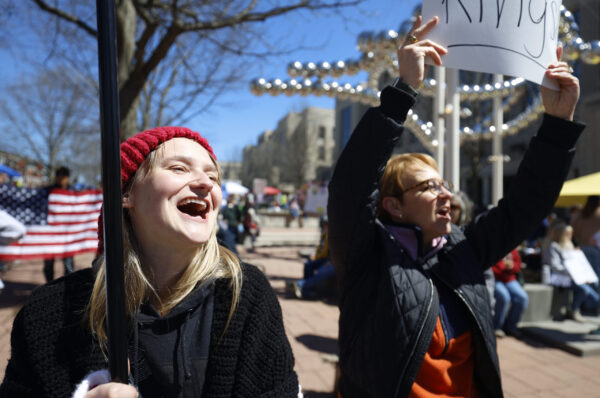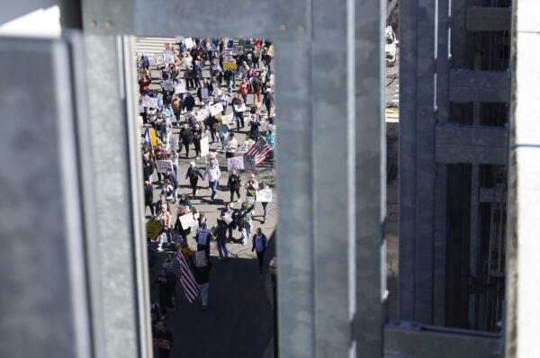 Groups of teachers, veterans and religious leaders spoke to a crowd of people outside the Robert F. Stephens Courthouse before attendees marched through downtown Lexington.