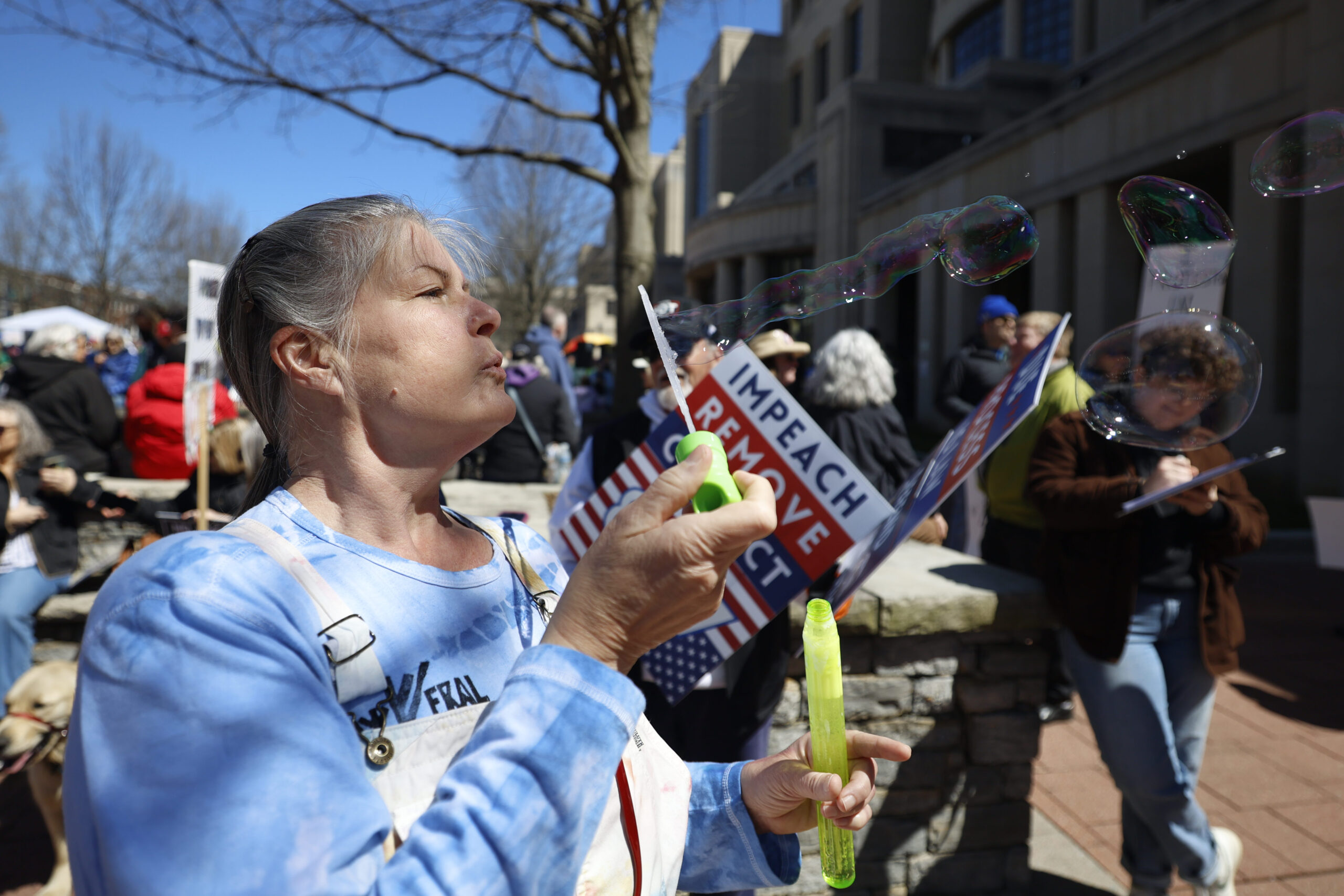 Kim McLaren blows bubbles outside the Robert F. Stephens Courthouse, in Lexington, Kentucky, on Saturday, March 28, 2026. Sydney Novack/The Watchdog