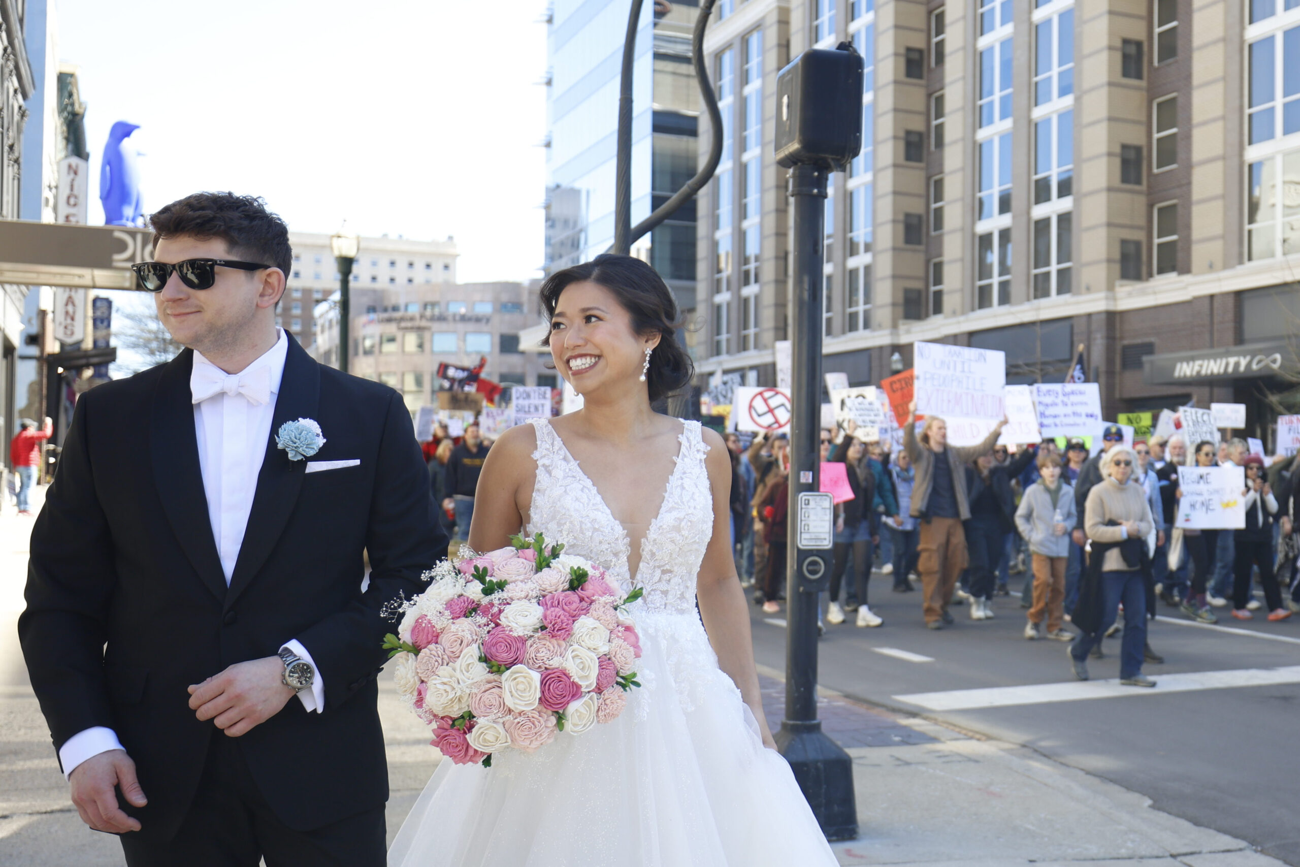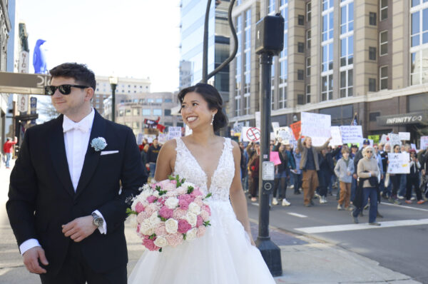 A couple on their wedding day walks down Main St. during the “No Kings” protest outside the Robert F. Stephens Courthouse, in Lexington, Kentucky, on Saturday, March 28, 2026. Sydney Novack/The Watchdog