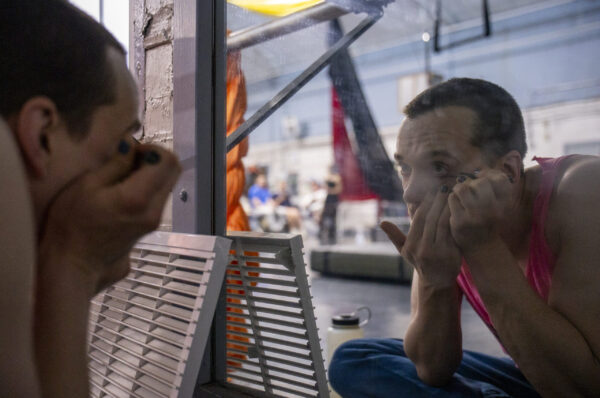 Mason Doodle applies makeup during the UKY Circus Cats Spring Showcase, “Dawn till Dusk” at Barker Hall in Lexington, Kentucky, on Friday, April 17, 2026. Peyton Tindall/The Watchdog