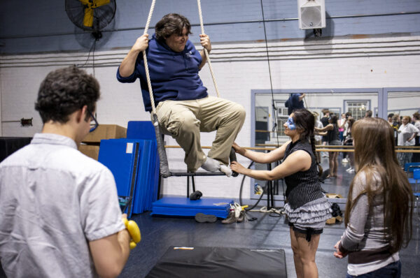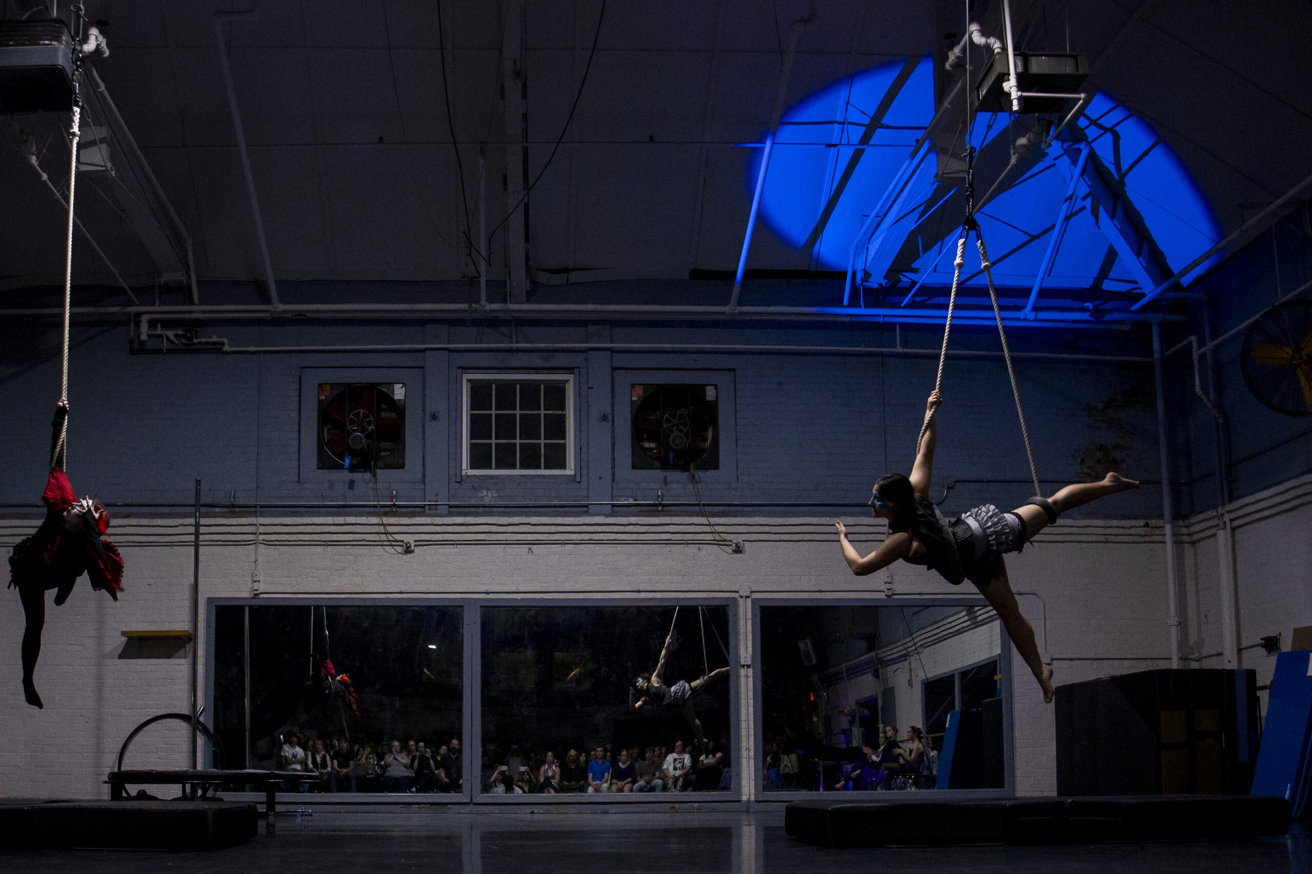 Liz Stuckenborg, left, and Maria Pamukova perform duo trapeze during the UKY Circus Cats Spring Showcase, “Dawn till Dusk” at Barker Hall in Lexington, Kentucky, on Friday, April 17, 2026. Peyton Tindall/The Watchdog