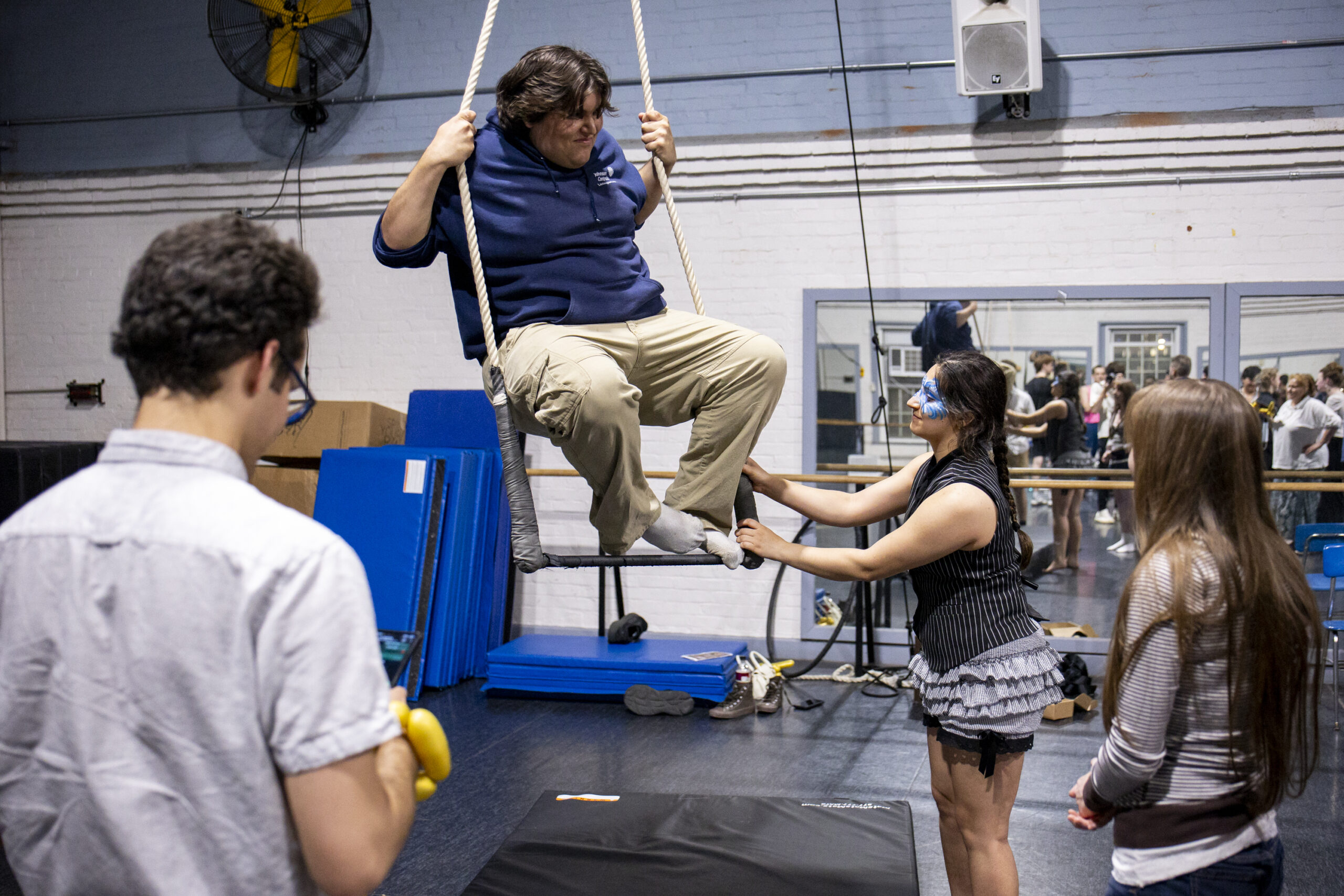 Rebecca Stankiewicz, left, and Anaya Ellis warm up on the Lyra during the UKY Circus Cats Spring Showcase, “Dawn till Dusk” at Barker Hall in Lexington, Kentucky, on Friday, April 17, 2026. Peyton Tindall/The Watchdog